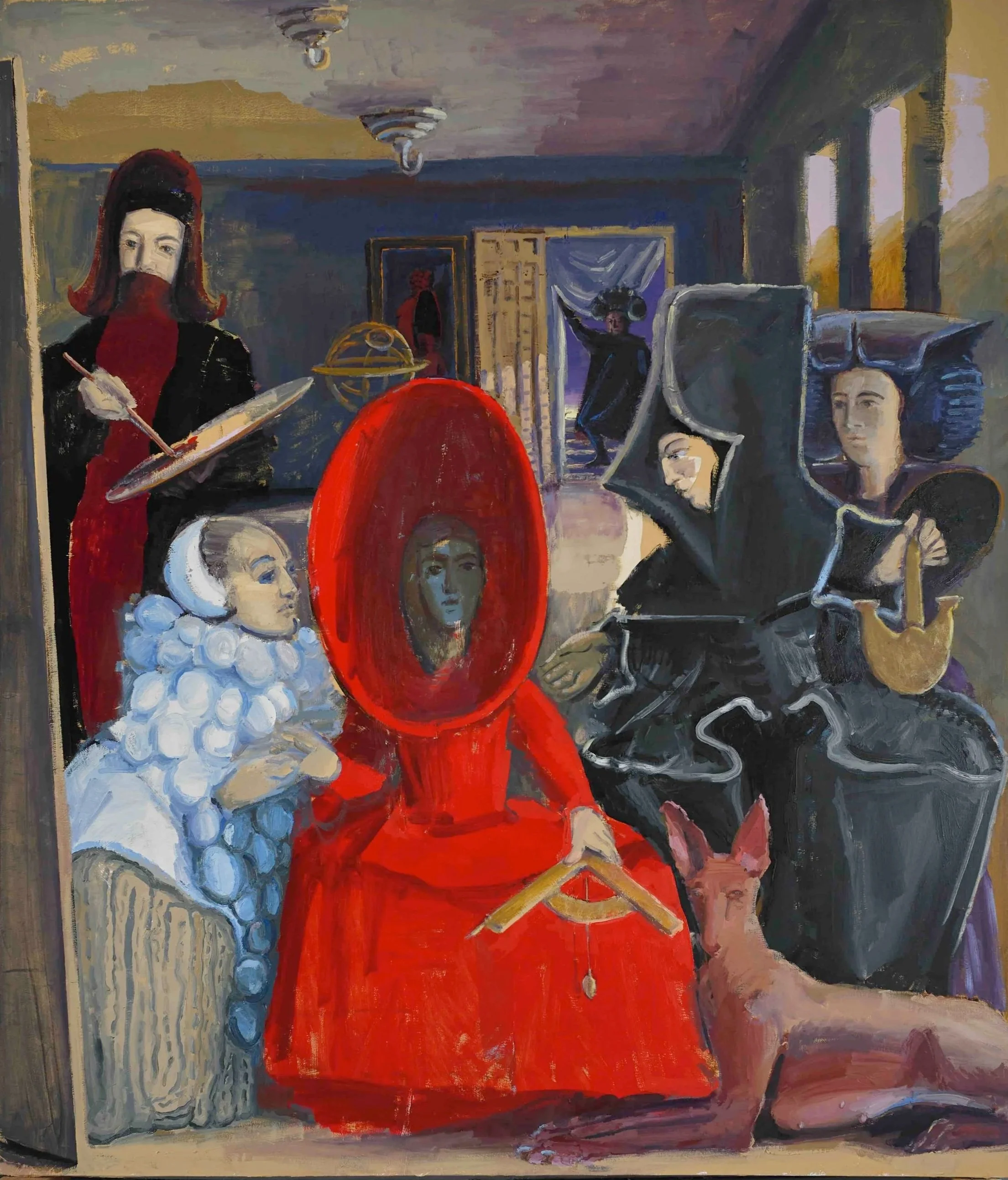 La Menarquia is set in the artist’s studio inside Philippa IV’s palace in 17th century Madrid. In the center foreground stands her daughter, the 12-year-old Infanta Margaret Teresa, moments before her royal Menarche ceremony, the much anticipated initiation rite marking her first blood. She wears a scarlet dress, a dramatic symbol of her blood power. Her partially concealed gaze reflects the upcoming transition from light to dark –from primal to higher consciousness – that is to unfold in the ceremony.