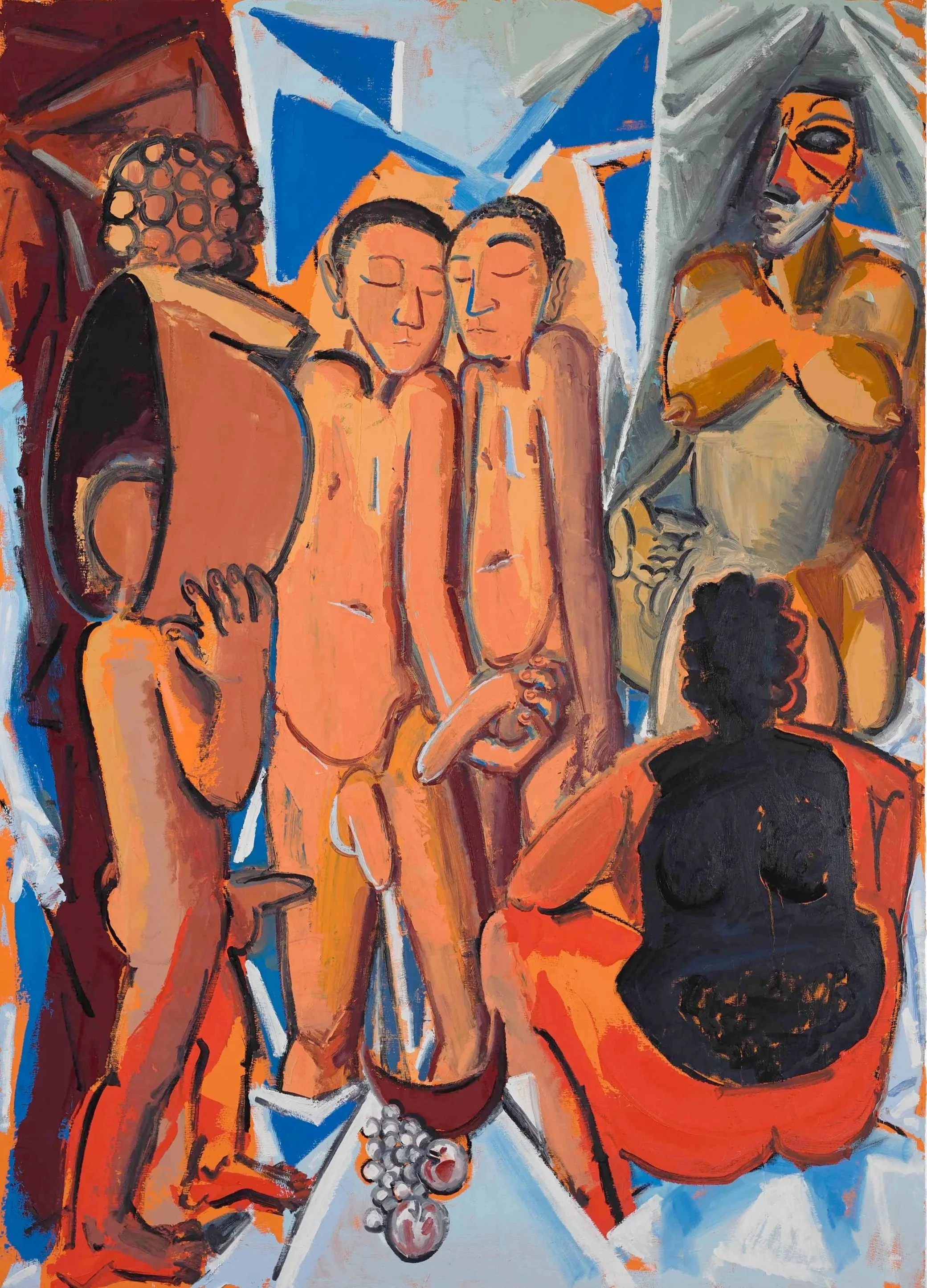 The stacked figures are often connected in the literature to the artist’s visit, midway through his work on the painting, to the the Musée d’Ethnographie du Trocadéro, Paris’s first anthropological museum. There, he had an epiphanic encounter with African and Oceanic art, which influenced the work’s ferocious anti-naturalism. It was also there that he likely encountered initial field studies by leading primatologists studying patterns of play in primates. Such studies reveal that Bonobos, who live in matriarchal clans, engage in frequent, promiscuous sexual play with members of all sexes, a practice linked to their ability to manage conflict and to their adaptability to change. (Behncke, 24-27). In the rapidly changing and uncertain environment of modern industrialization and urbanization, the artist was no doubt excited by the implications of this evolutionary lens on human behavior and used the work to provoke public conversation.